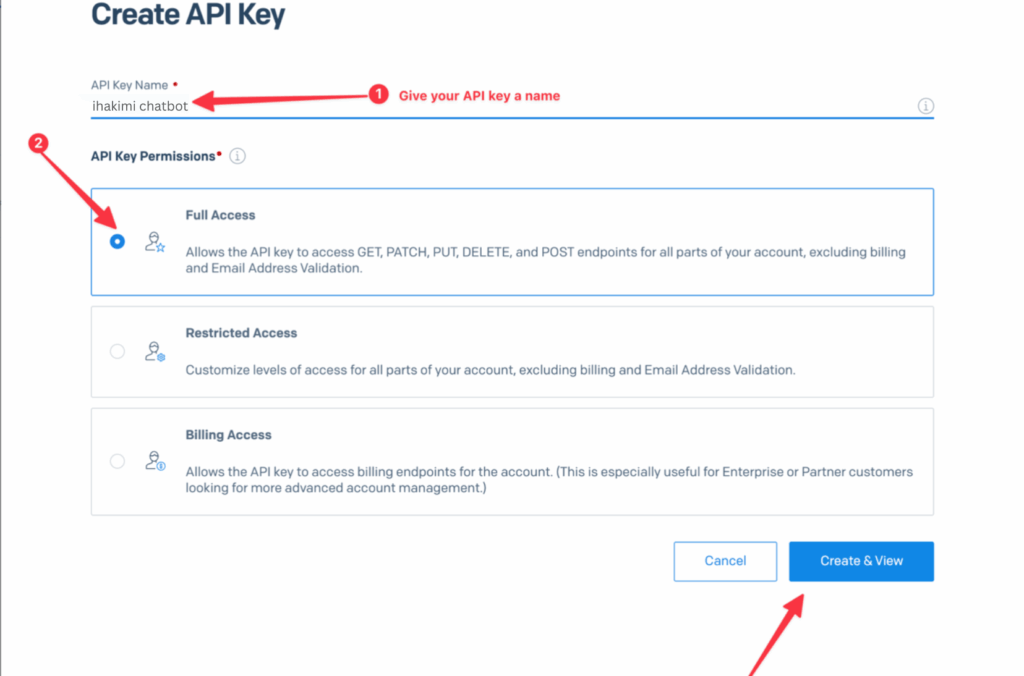 From the next screen that will be loaded you will need to give your API key a name, give it full access and finally press the button “Create & View”