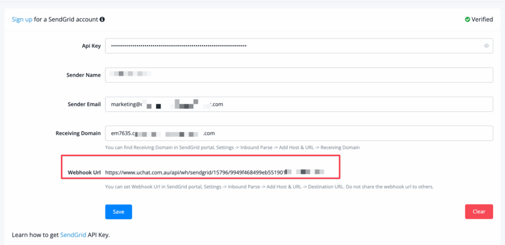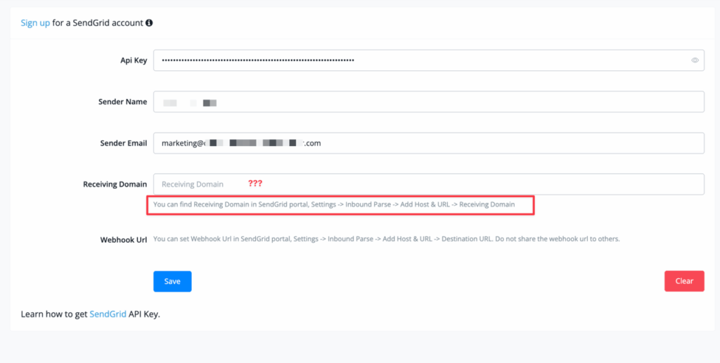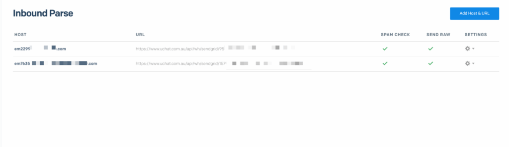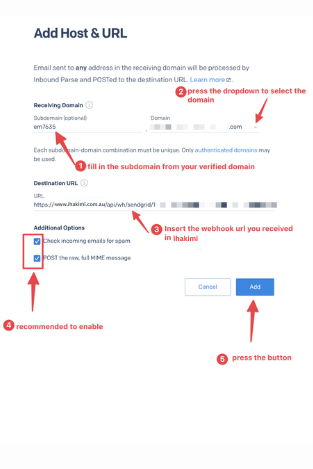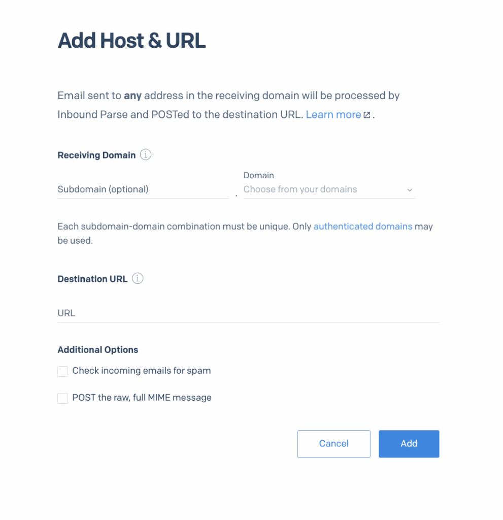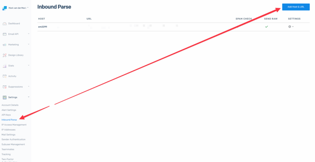 Just copy the webhook url and then go back to Sendgrid -› Settings -> Inbound Parse -> Add Host & URL -> Receiving Domain. From here press the button “Add host & URL”
