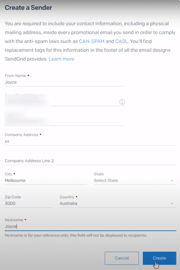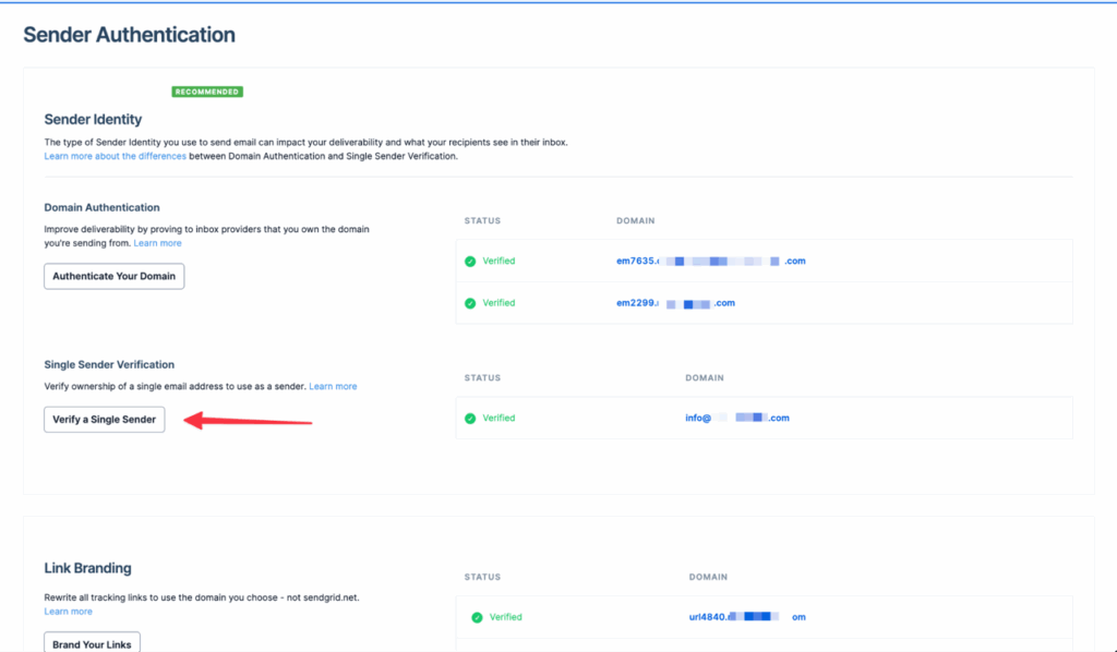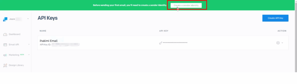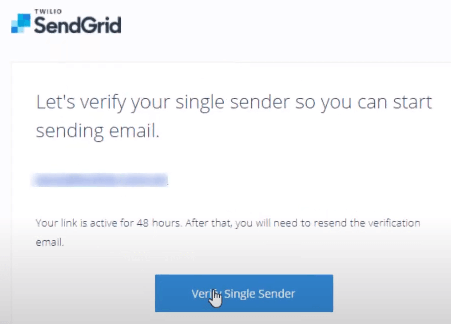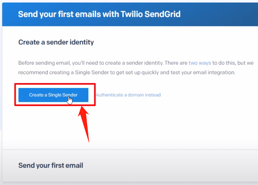 To get a “Sender Email”, let’s get back to SendGrid’s website again. Click “Create a sender identity” and “Greate a Single Sender”: