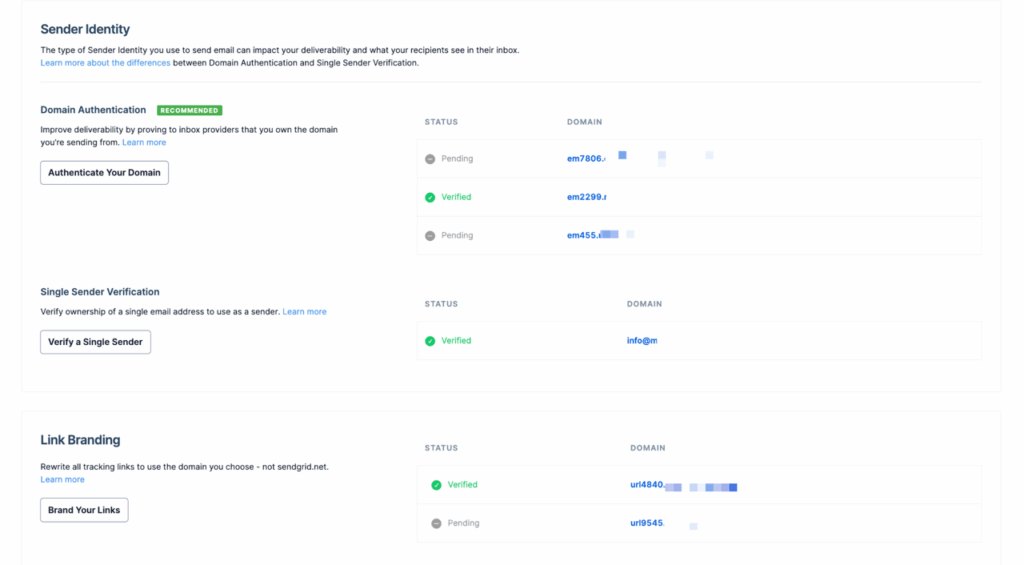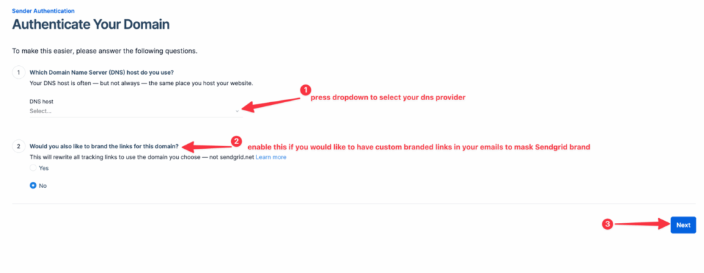 2. Branded links. If you would like to have branded links appear in your emails then you will need to enable this option. Once doing so it will add an extra CNAME record in the next overview