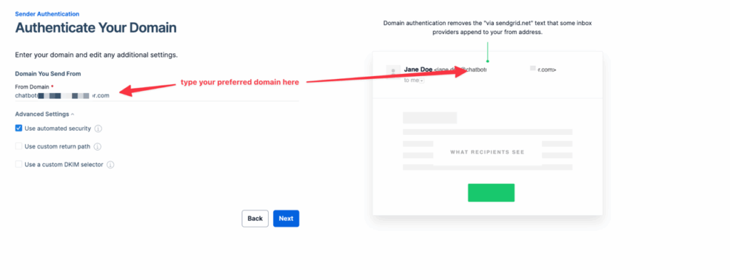 When done you can go to the advanced settings below your typed domain and select any of the options. The standard automated security will be enough.