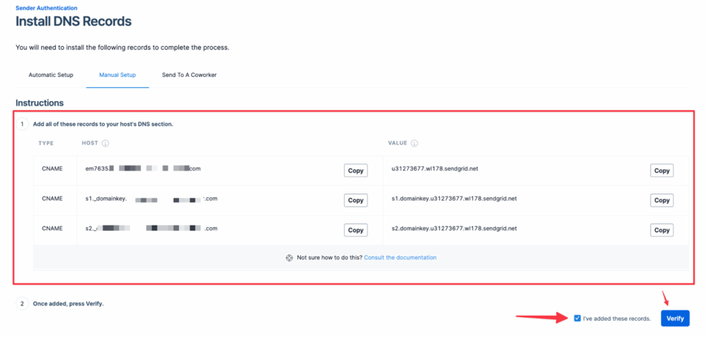 Once you have added it and some time has passed checkmark the box named “I’ve added these records” and then press the button “Verify”. Both can be found at the bottom right corner of this dns overview page