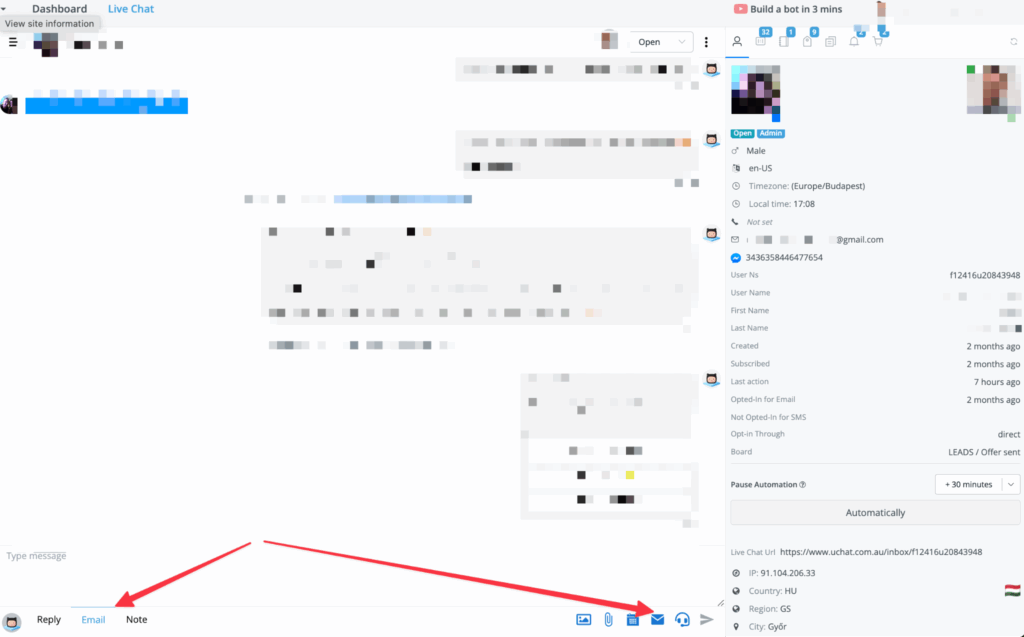 Let’s head into a chatbot and go to a live chat conversation with a bot user who already opted in for email and create an email to send.