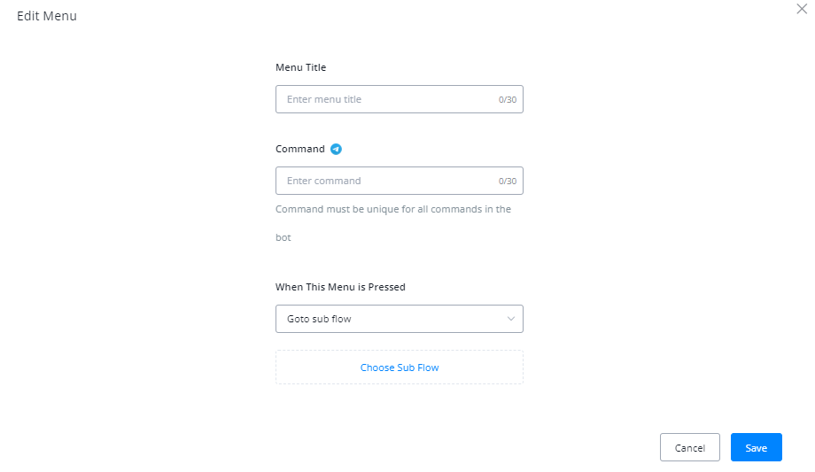 Add your menu title and make sure to choose a subflow then click Save. This is where your user will be sent once the menu is pressed.