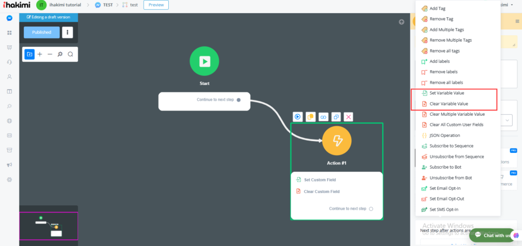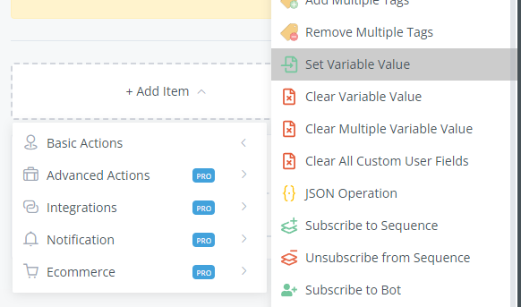 Click “Basic Actions” in the Action step and here are the “Set Variable Value” and “Clear Variable Value”.