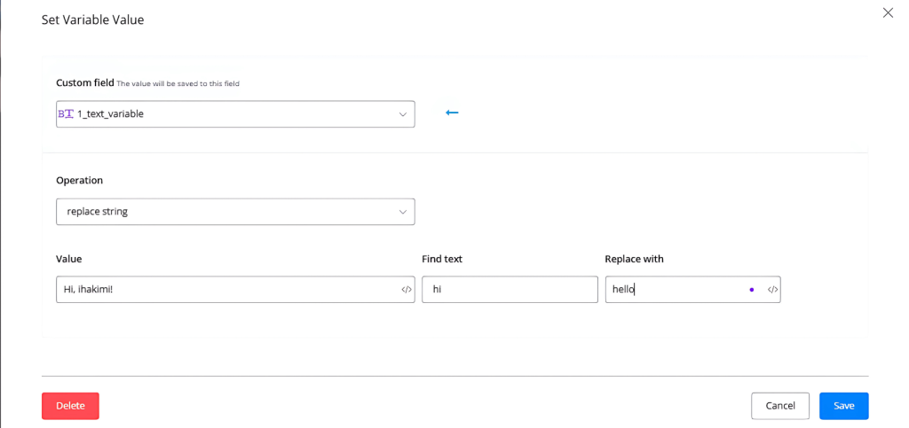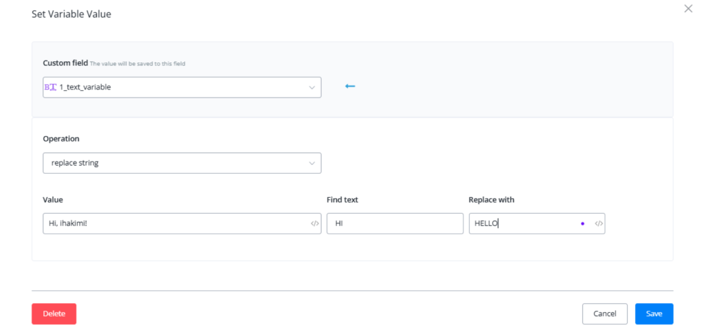 | replace part of the text | “Hi, ihakimi!” | “Hello, ihakimi!” |