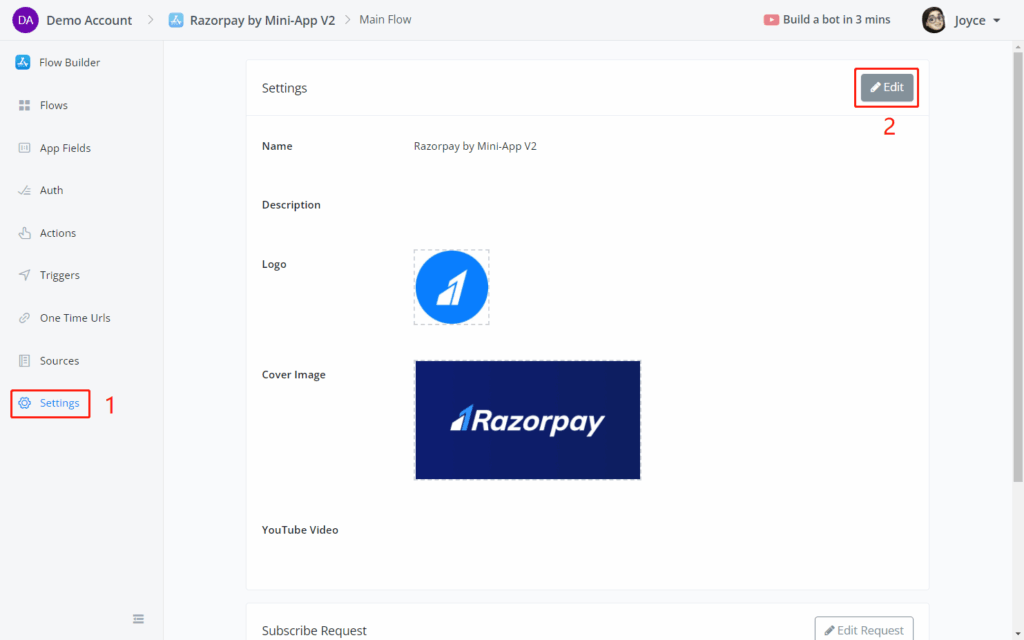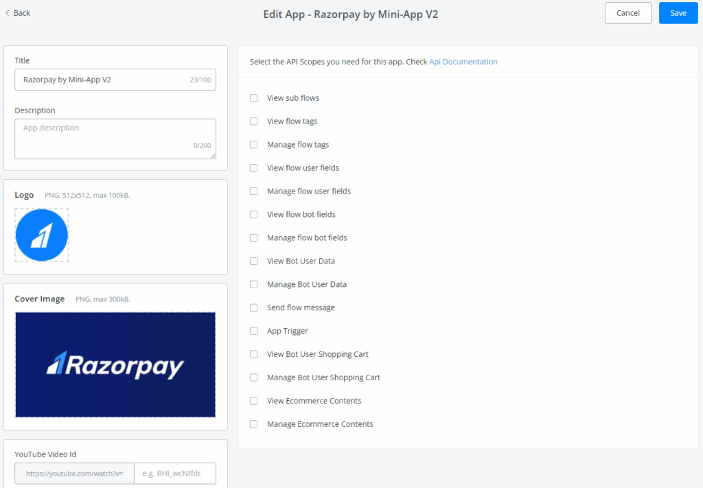 The settings section is where you provide basic information about your app, including app name, description, logo, cover image, video link and API scope.