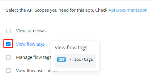 In the API scope, check which scope the app needs to access in users’ chatbots. For example, if your app needs to read tags in the user’s chatbot, check “View flow tags” here:
