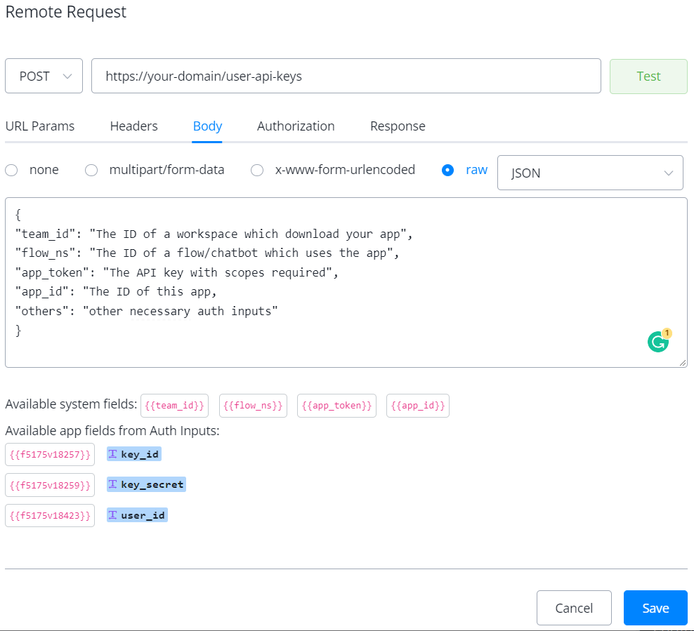 By setting up the above external request, the system will send you the information after users install the app and provide the auth inputs