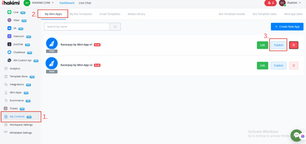 To share your app publicly in ihakimi Mini-App Store, for free or paid, go to the publish page of your app: