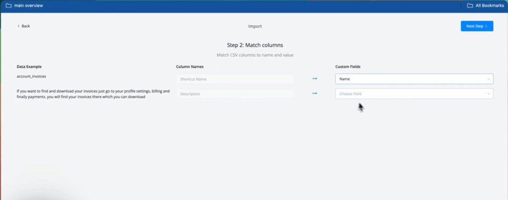 - Verify that the “Shortcut Name” column is mapped to the “Name” field and the “Description” column is mapped to the “Value” field.