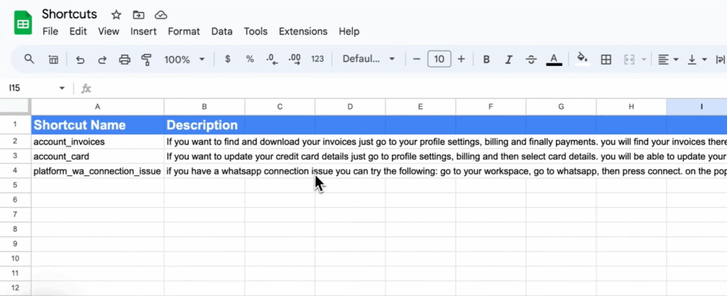 - Shortcut Name: This column will contain the names you assign to each shortcut.