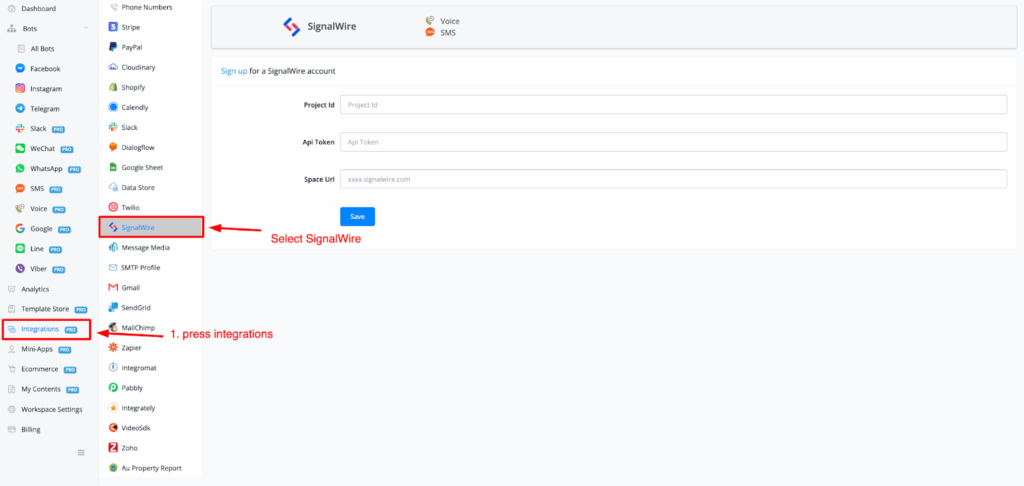 From the main dashboard overview, choose integrations on the left-hand side, then select Signalwire from the list.
