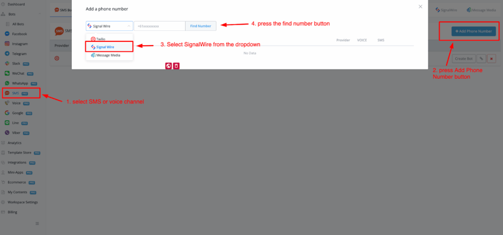 From the dropdown select SignalWire, then press the button find number.