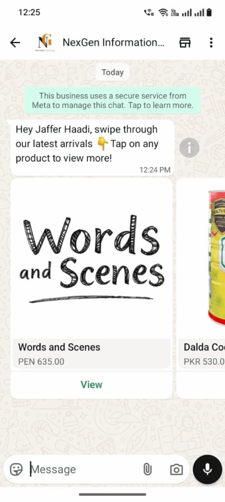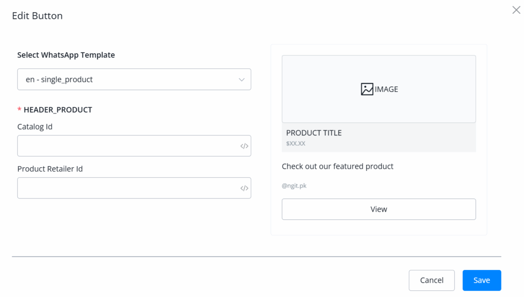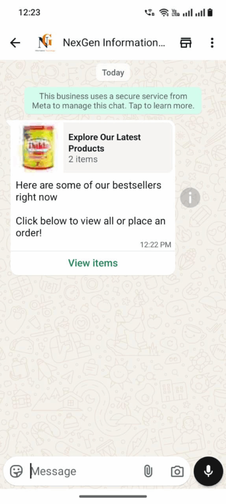This template allows you to share a specific item from your catalog directly in a WhatsApp message. The message displays the product’s image, name, price, and a short description, along with a button that lets users view the product and add it to their cart, without leaving WhatsApp.