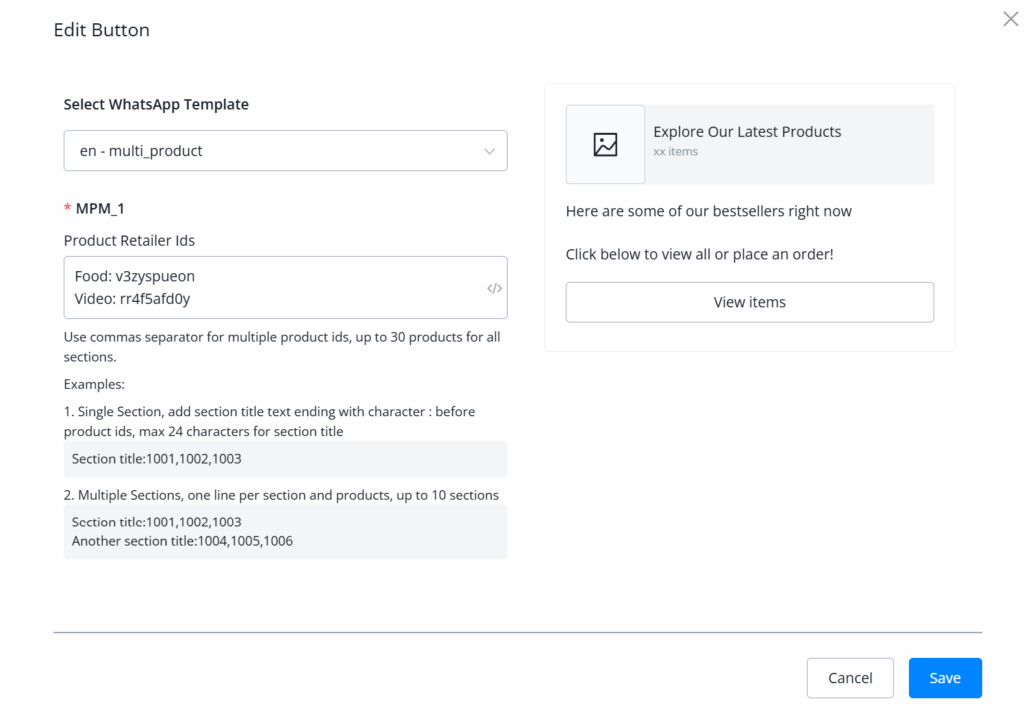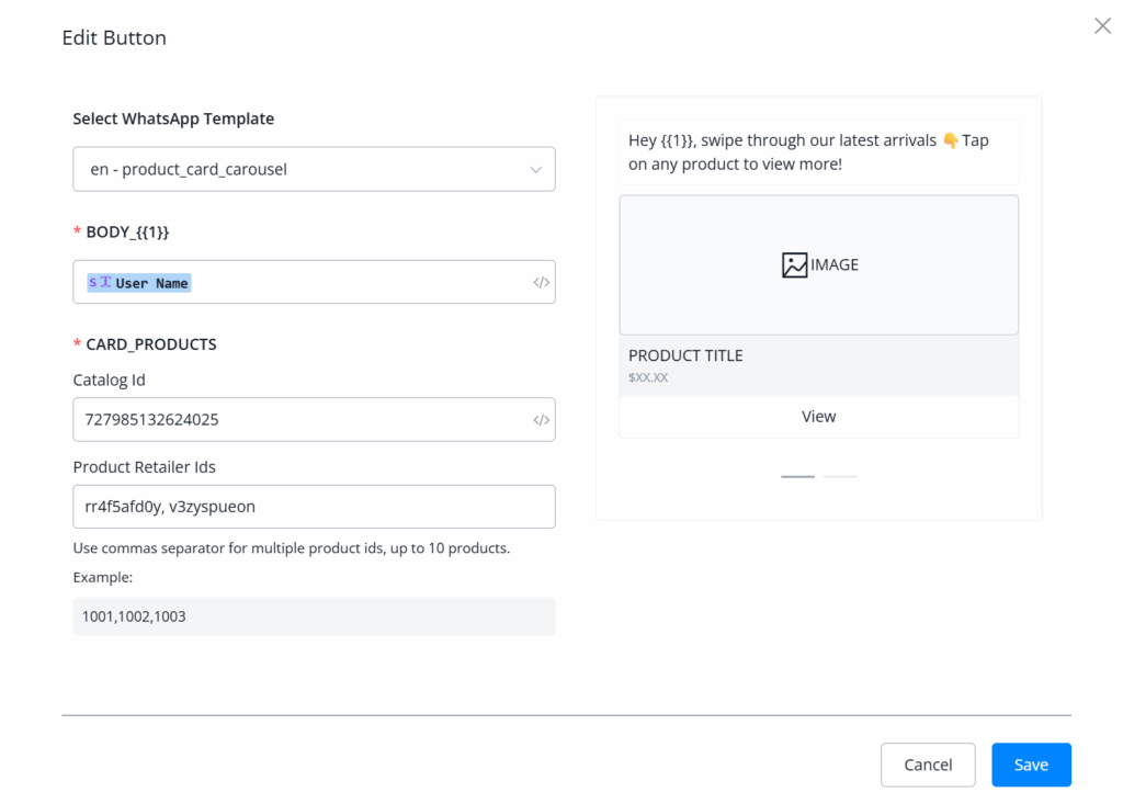 To send a Carousel Template message, you’ll need to provide your Catalog ID and list the Product Retailer IDs (SKUs) separated by commas.