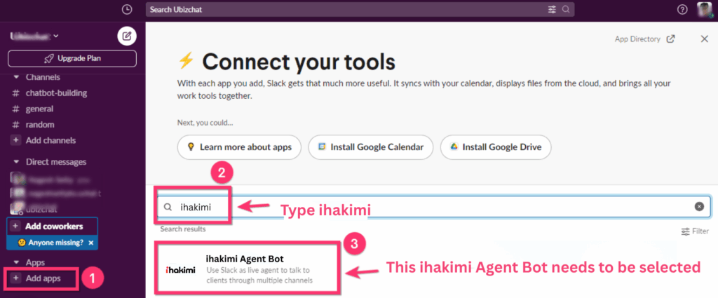 Goto Slack Workspace > Add Apps > Type ihakimi > Select “ihakimi Agent Bot”