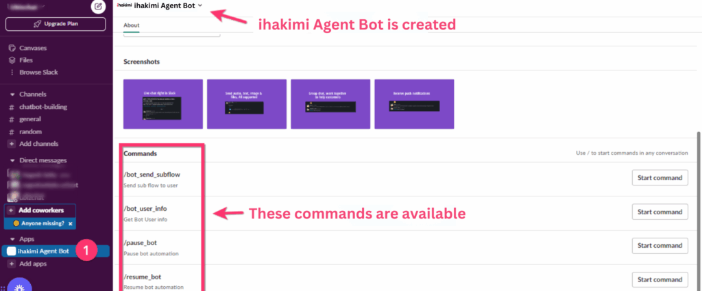 Let’s try one of the command, let’s say use this command inside the Slack Live Chat /bot_user_info