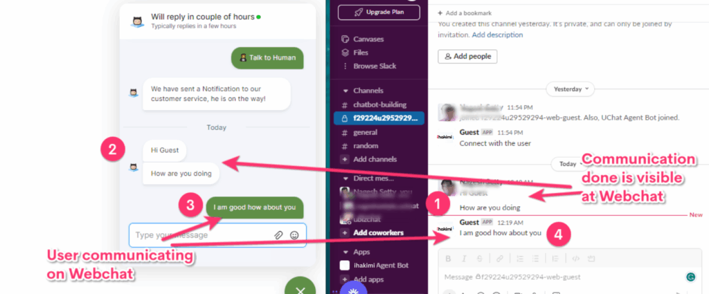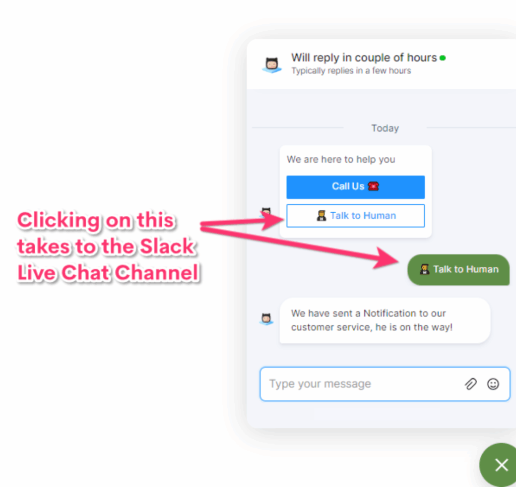 If we go towards our webchat widget, and just start interacting inside the web chat widget, and say, Let’s connect, you can see there is a Button to talk to Human, once clicked on this button, it notifies on Slack and Live chat support is activated.