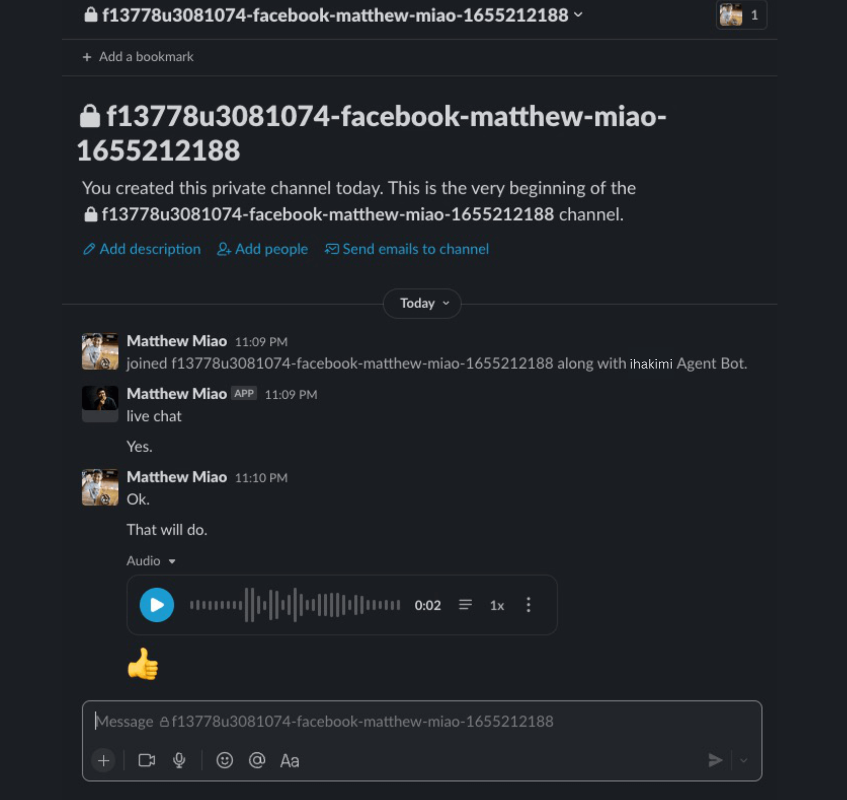 - You can reply & send audio, text, picture, and files to the user directly on Slack