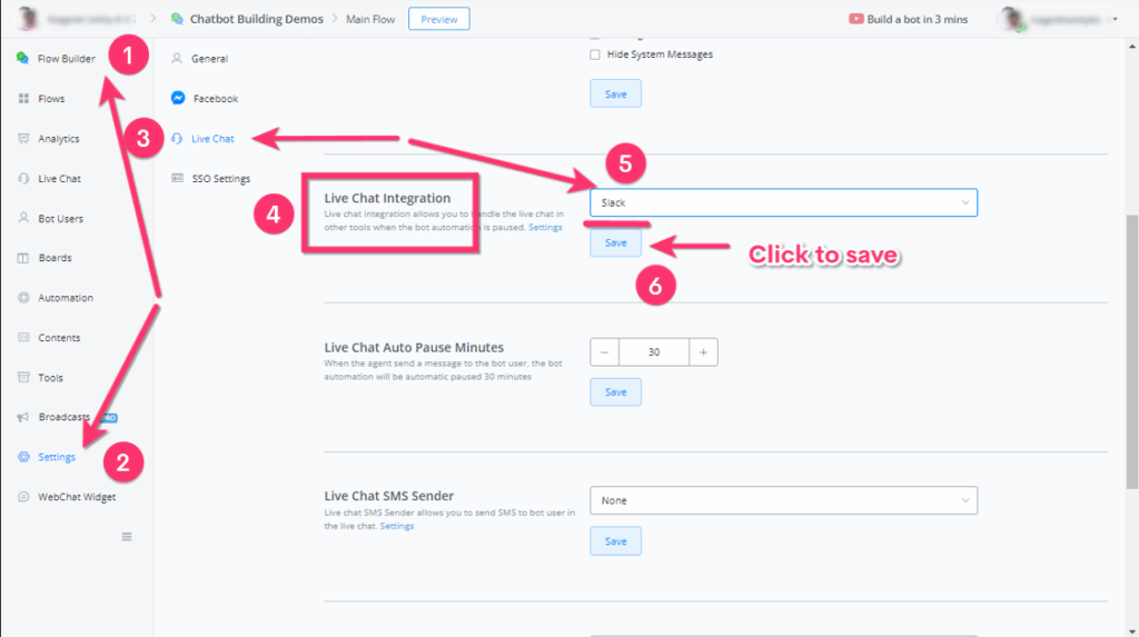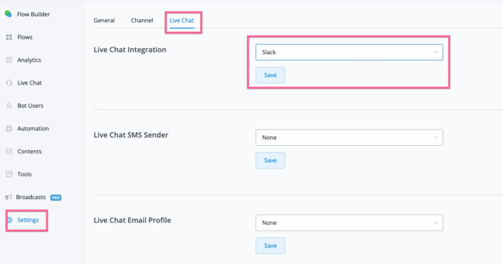 Flowbuilder Menu > Settings > Live Chat > Live Chat Integration > Select Slack > Save