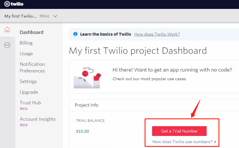 Take Twilio as an example. On their website, sign up, login in, then you will get to your dashboard: