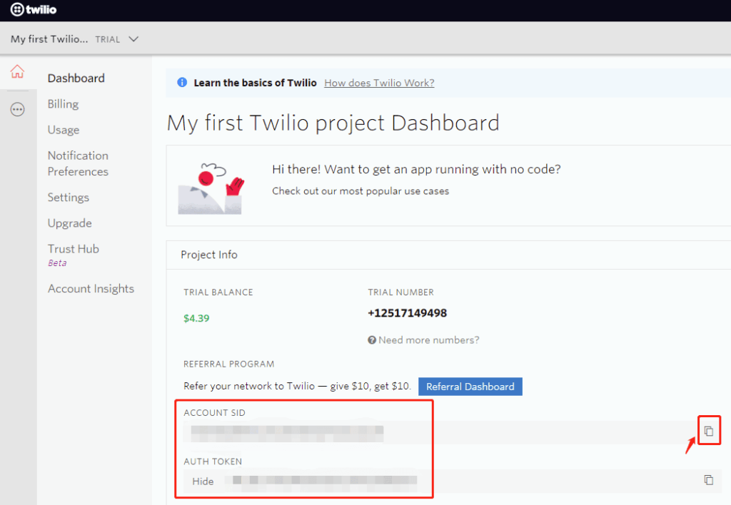 In your Twilio account, copy the account SID and account Auth Token as per the screenshot below: