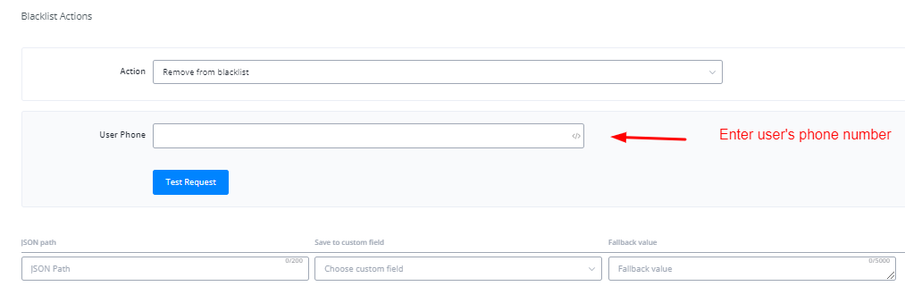 This action allows you to remove bot users from the black list using their phone number