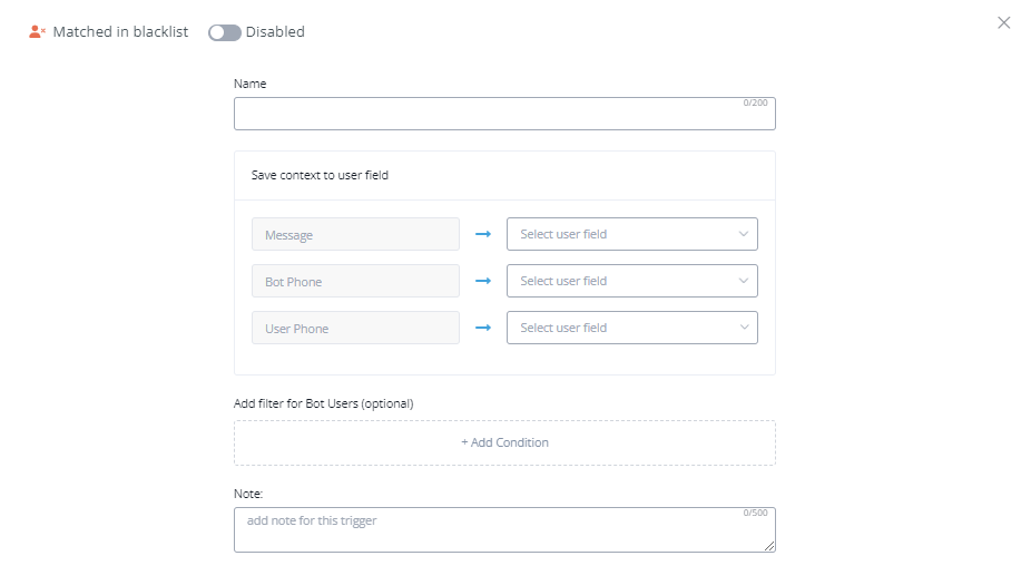 If a user tries to contact you again, or enters a system when they are already inside the black list, you can use this trigger to execute different conditions and actions.