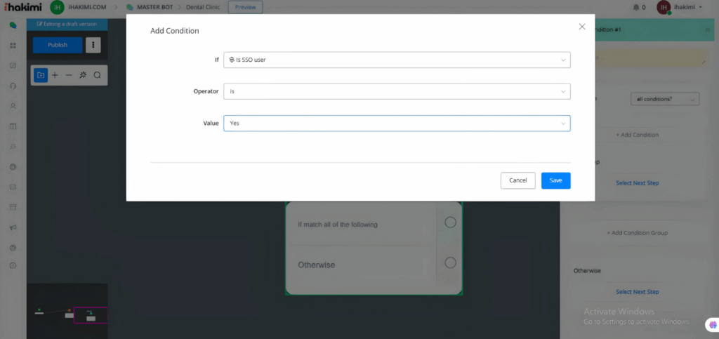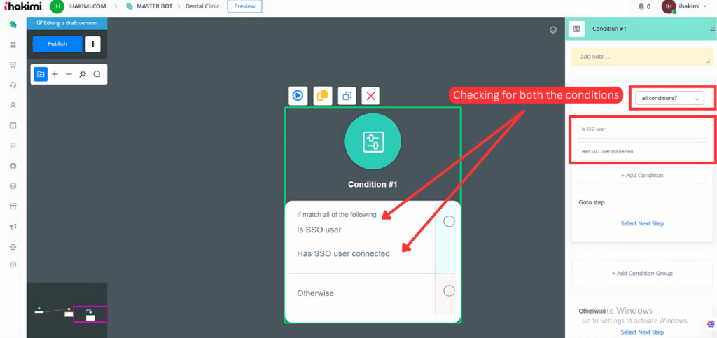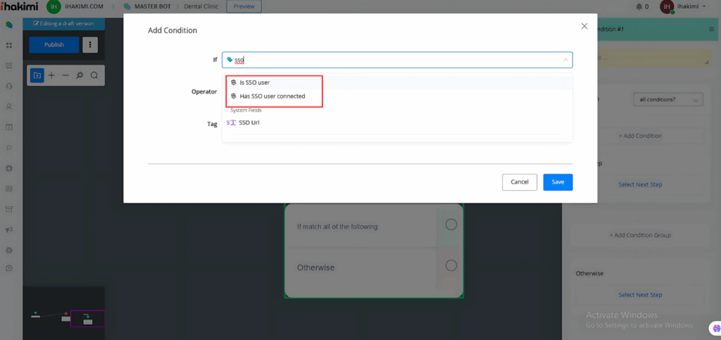 Now use a condition either “Is user SSO” or “Has SSO user connected” or you can use both of these conditions and check them if they both are true.