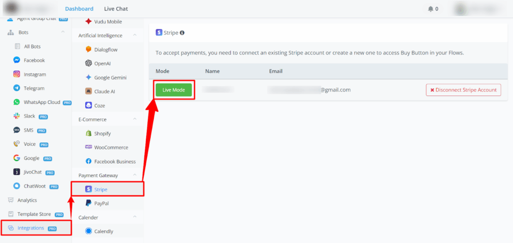 - Ensure that the mode is set to “Live Mode” to accept real payments. If you haven’t connected a Stripe account yet, do so at this stage.