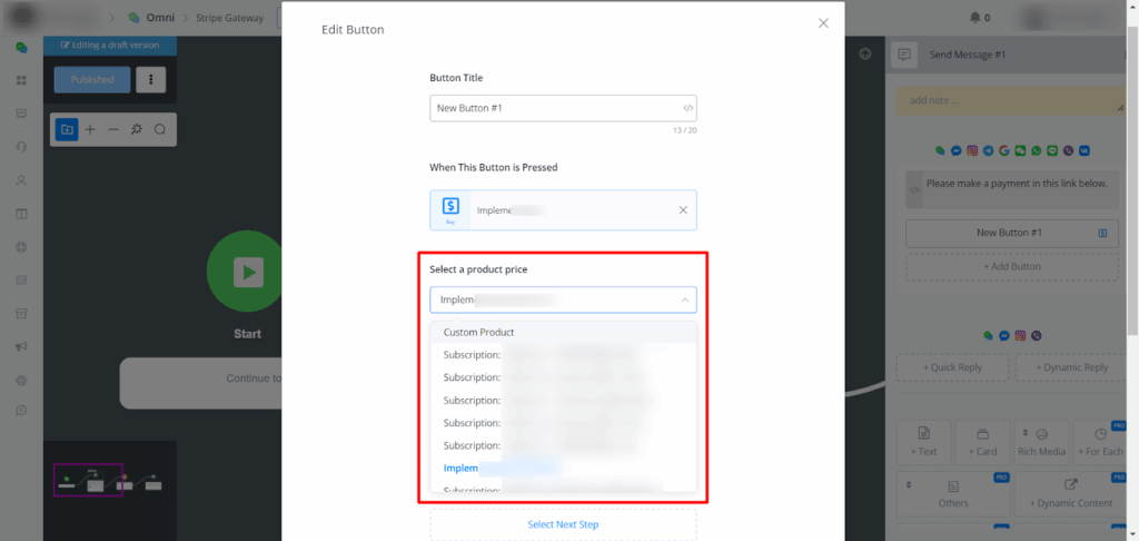 - In the button configuration, give the button a title, such as “Pay Now.” for example. Under “Select a pre-set price,” choose the product or service for which the payment will be made. If you haven’t set up products beforehand, select “Custom Product” and manually set the price.