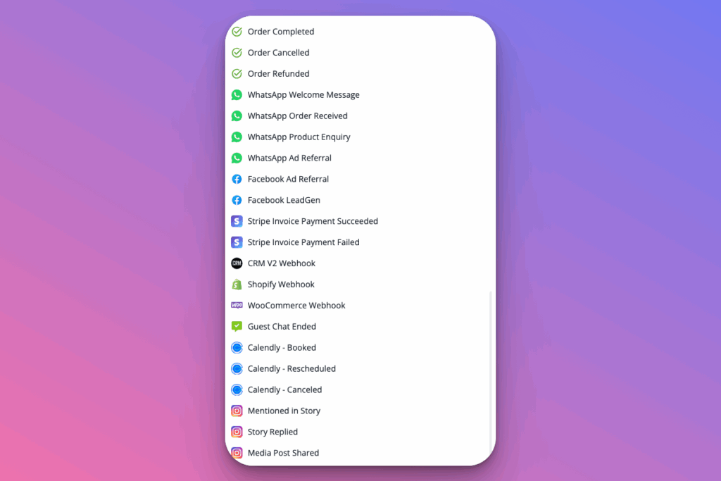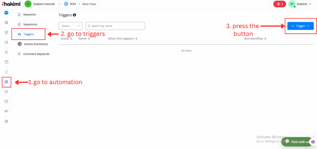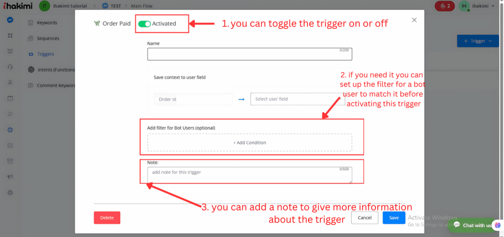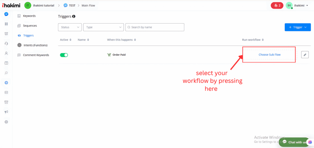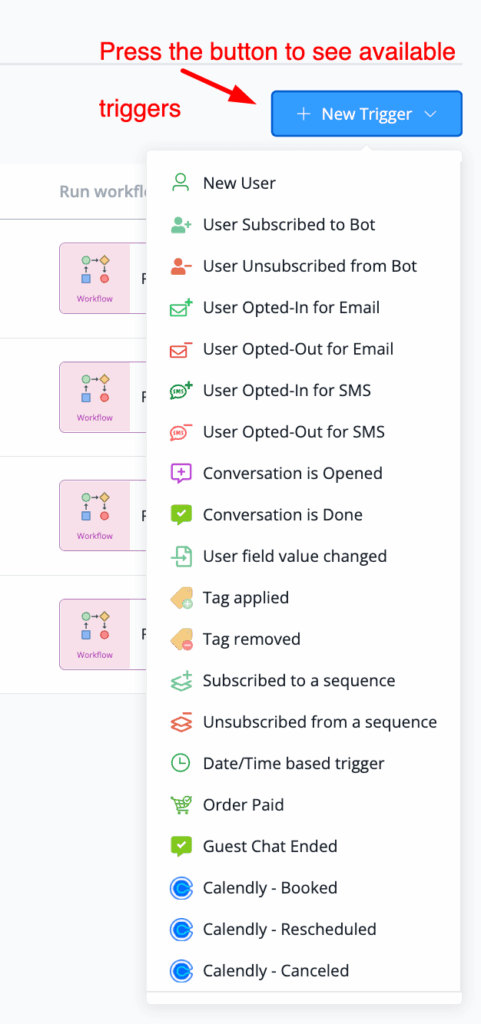 Let’s take an example of a trigger when someone pays for order inside your chatbot. Press the blue button + New trigger then select the trigger named as such: Order Paid