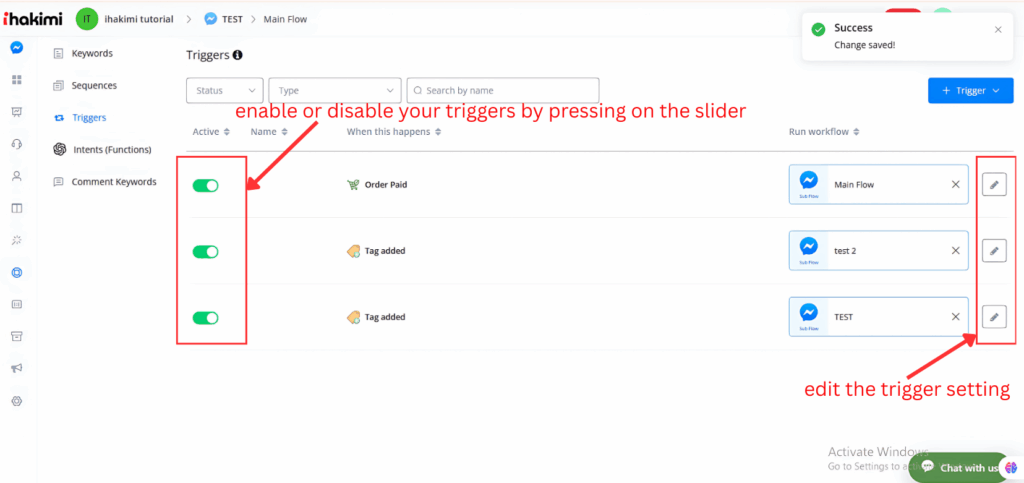 - You can enable or disable them by pressing the slider on the left of the actual trigger