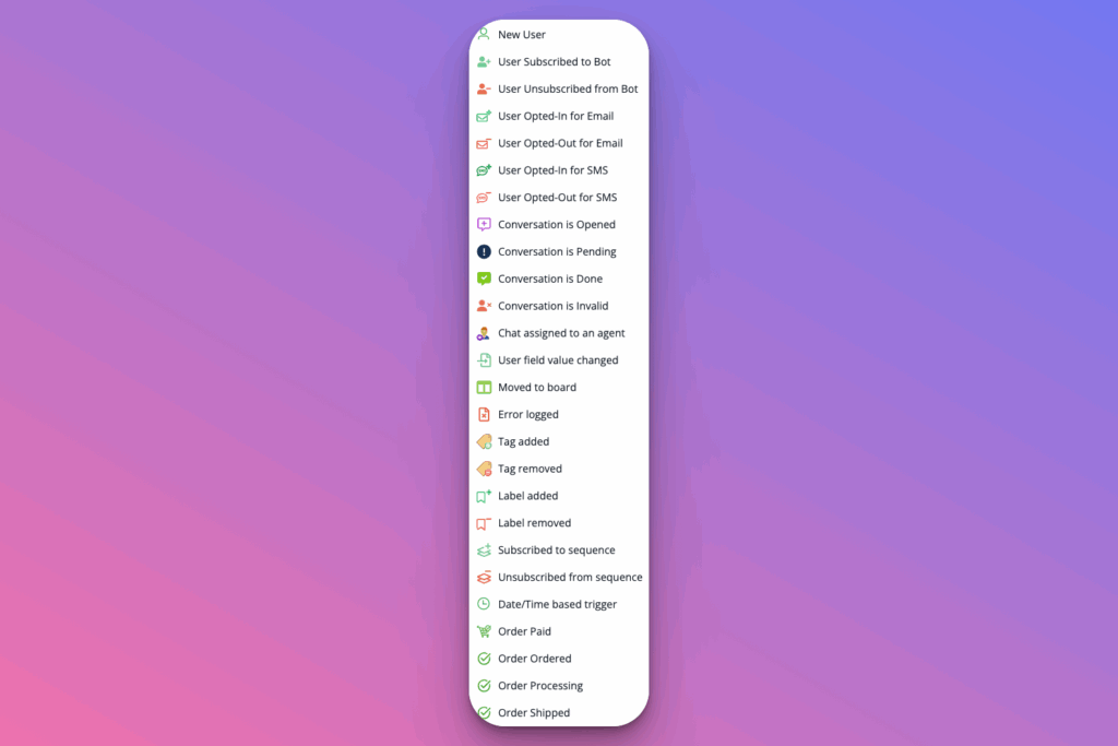 Triggers can help you automate certain processes in the chatbot. For example, when a user has opted-in for email you might want to sync this data with a CRM or Google Sheet.