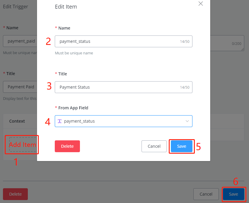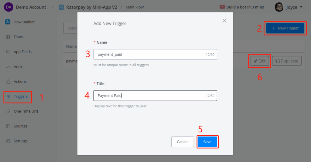 To create a trigger, follow steps 1 to 6 in the following screenshot: