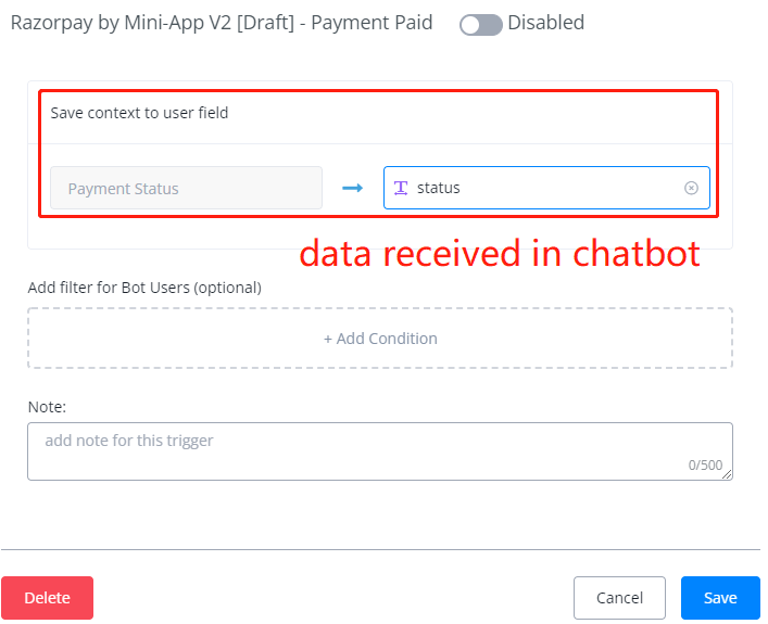 Click on Add Item to specify what information to send back to the chatbot. For example, a payment status: