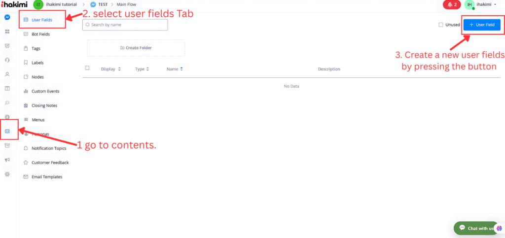 Just go to any flow and from here you can create user fields anywhere you need to use them.