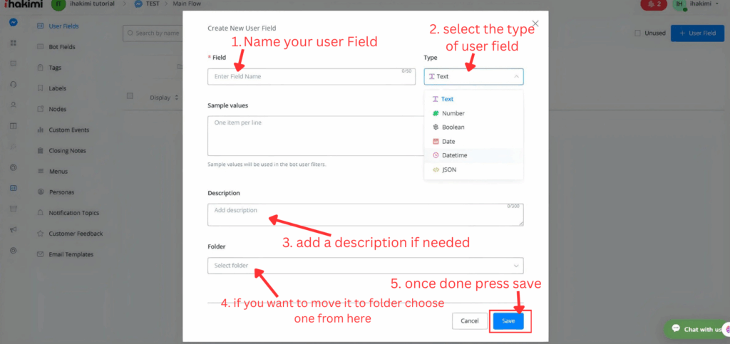 Another way to create a user field is by doing so directly inside the flow builder. This has the huge advantage that you can create user fields on the fly and not have to go to the user fields overview tab first.