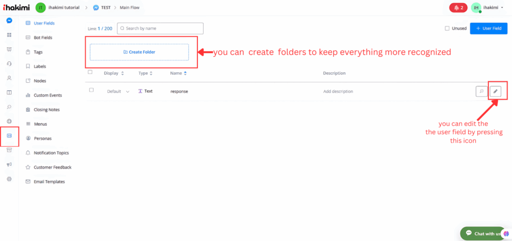 You can create folders to keep your user field overview more structured and let you allow to find your user fields more easily.