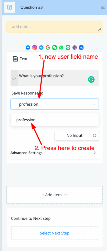 These fields allow you to set up all kinds of options inside your chatbot including saving data from bot users or API calls as an array.