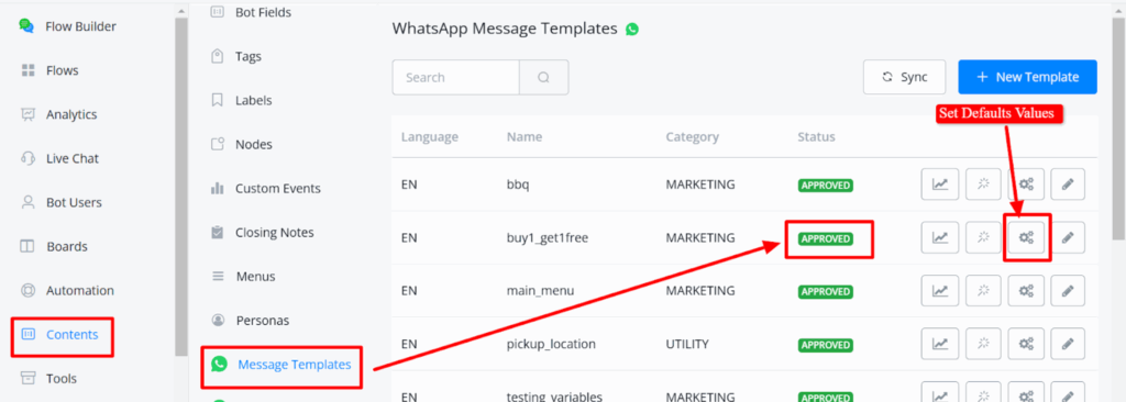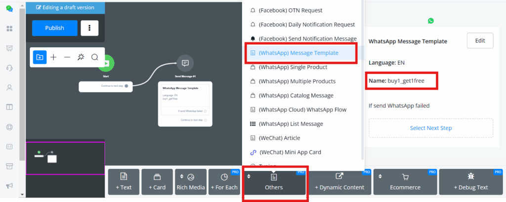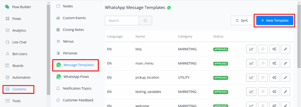 In your flow builder, use the Message Node → Others → WhatsApp Template Message, and select the relevant template.
