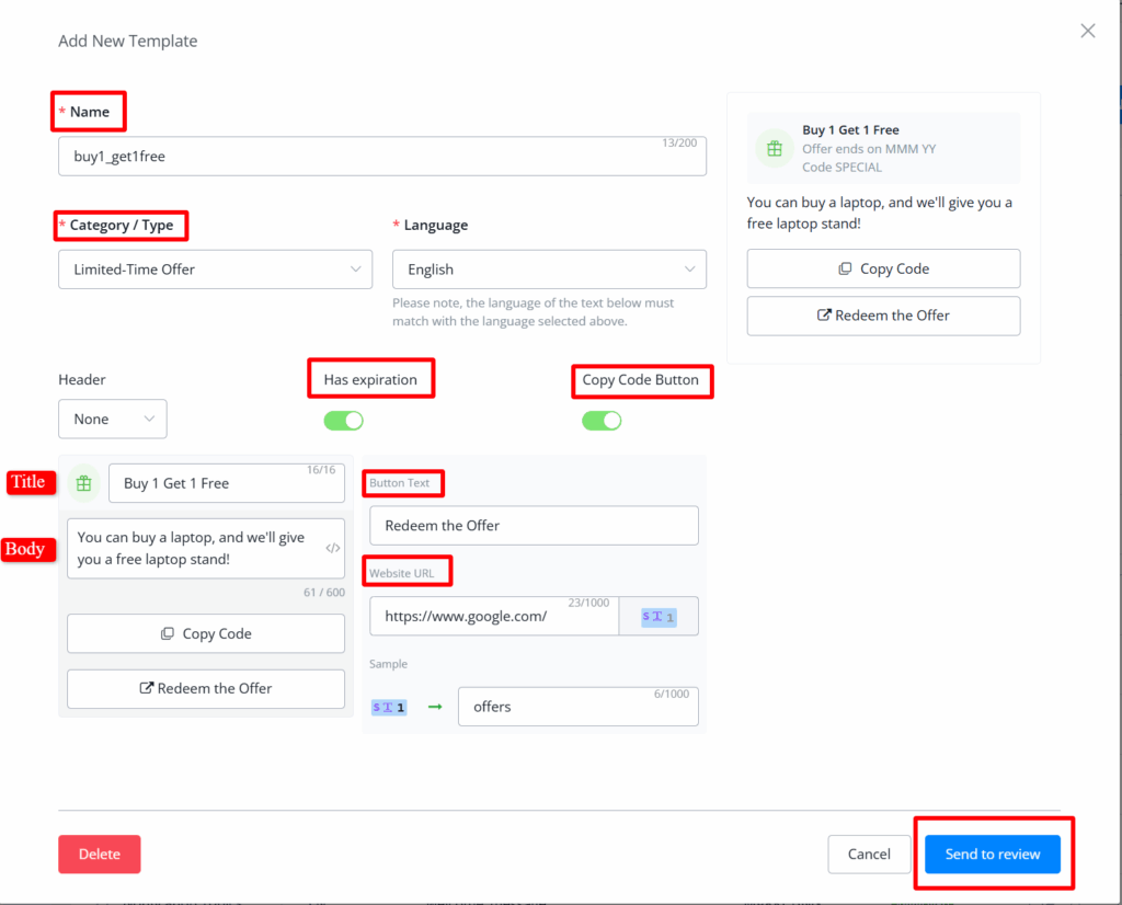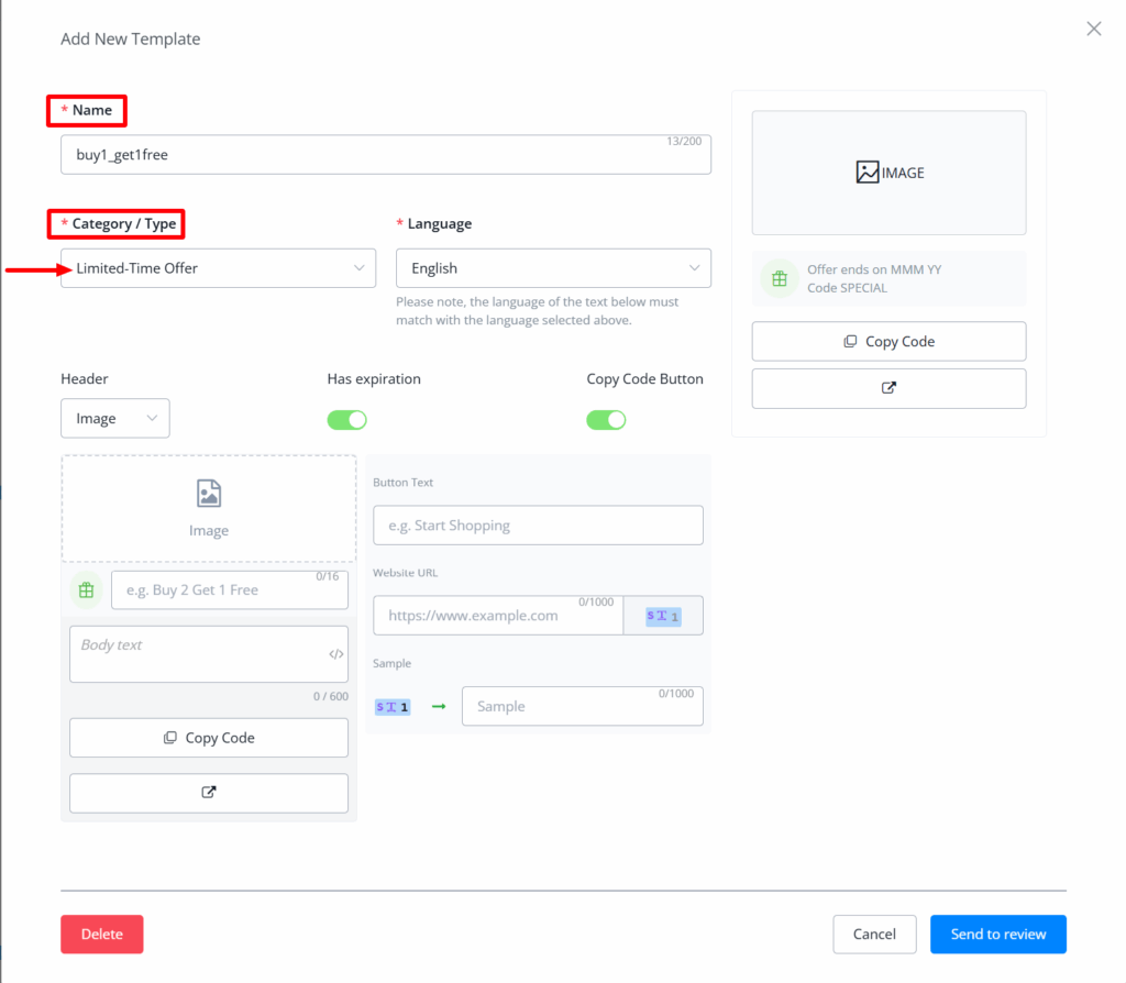 You can Customize the template according to your preference, add an image or video to the header, set the expiration date, and set the copy code option. Fill out all the details buttons, including the title and your website URL where this offer is available, and send this template to review.