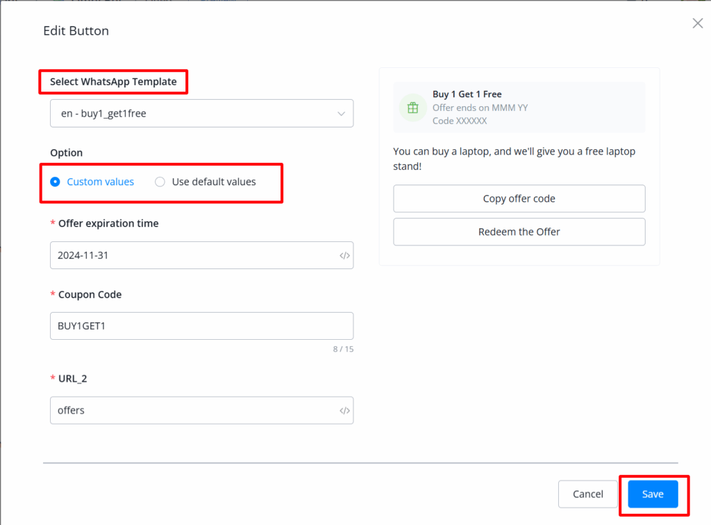 In the default values, set the expiration date upon enabling, enter the coupon code, and specify the website’s offer page URL.