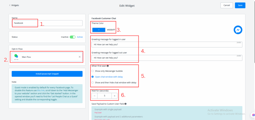 For Facebook bots, you can set some widgets to quickly start talking to the bot. To setup: