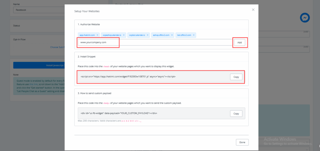 Add the websites that you want to put this bot at. Then install the snippet by copying and pasting the code.