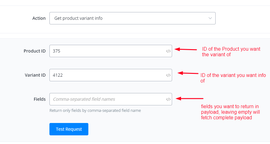This action is used to fetch information for a variant using its variant ID and product ID