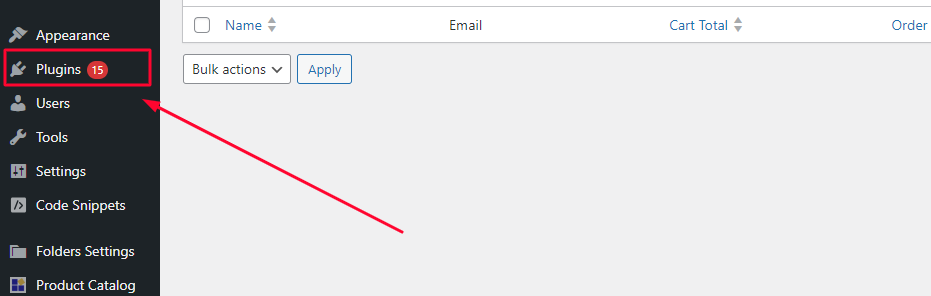 Once logged in, go from your woocommerce dashboard, scroll down till you see the plugins tab on the left scroll menu.