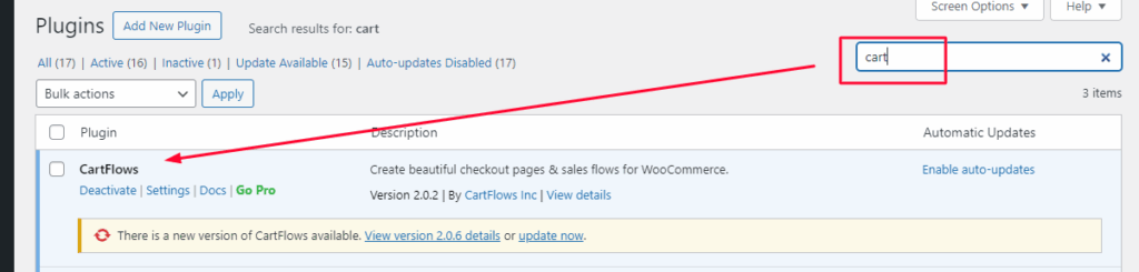 Click on “Add new plugin” and type “cart” inside the search bar. You will now have multiple plugins to choose from, for this documentation we will use Cartflows.