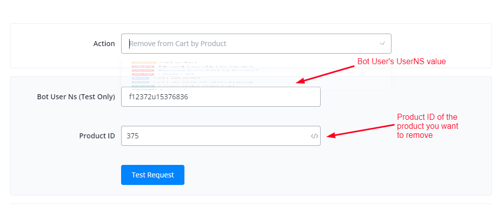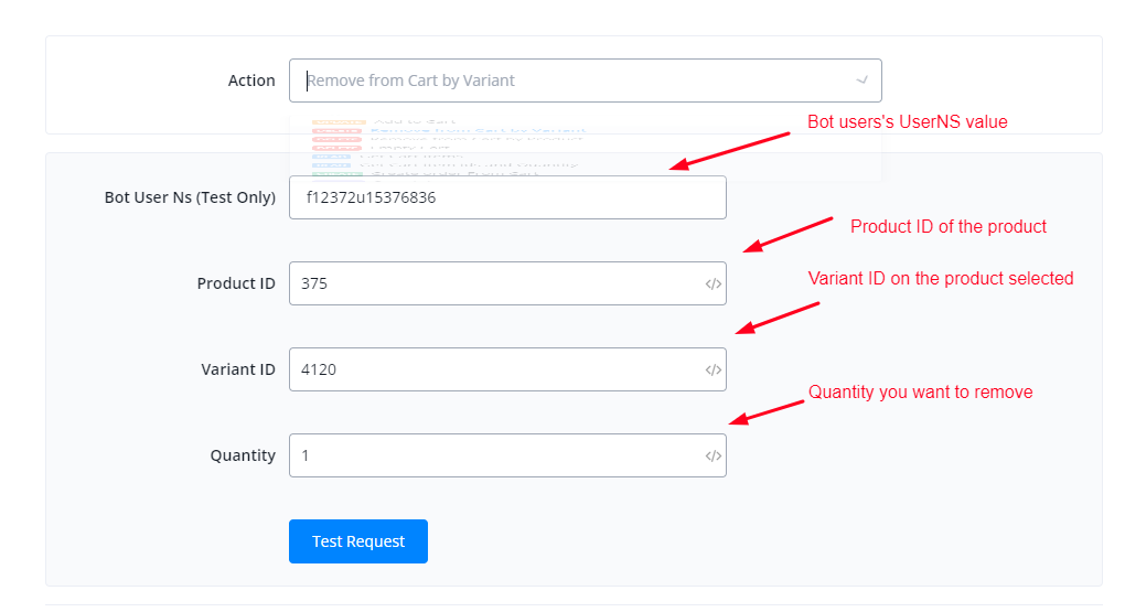 This action is used to remove an item or product from cart using its variant and product ID.